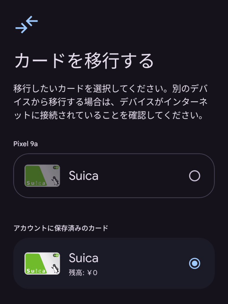 少なくとも僕のGoogleアカウントに紐づけられている交通系ICカードはモバイルSuicaが2種とモバイルICOCAであり、Pixel Watchに移行させるモバイルSuicaは上の図のように選択可能ということがわかりました。