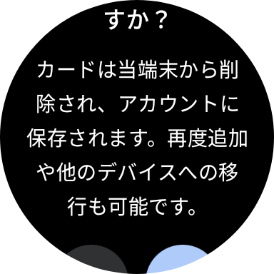 まず、サーバーに預けるためにモバイルSuicaからPixel Watchを削除する必要があります。Pixel WatchにてGoogleウォレットを開いてください。次に、登録されているモバイルSuicaをタップ。「カードを削除」という選択肢が一番下にあるので、それを選択すると下に示す画像のようなメッセージが出るので削除してください。削除という表現なので全てを失ってしまうかのようなイメージがありますが、図に示してるように「アカウントに保存されます」とあるので信じて、チェックボタンをタップ。